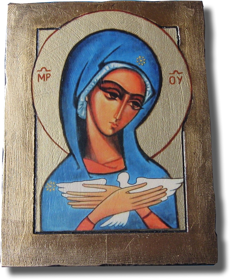Ikona wykonana metoda nadruku na drewnie olchowym, ozdabiane złotem płatkowym (szlagmetal), werniksowane.. Doskonały prezent na pamiątkę sakramentu bierzmowania.. Ikona maryja niosąca ducha świętego.